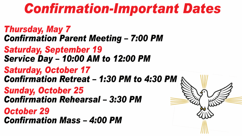 Confirmation will take place on October 20, 2025 for children who are currently in CFF Level 7 or in the 7th grade in Catholic or private Catholic schools. If you have not received information regarding Confirmation and you expect your child to receive the Sacrament this year, please contact us.