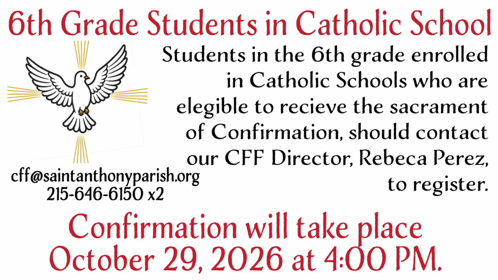 First Holy Communion takes place for CFF and Our Lady of Mercy Students on April 25, 2026 at 10:00 AM in church. Local private Catholic Schools have permission to receive First Communion with their school communities.